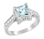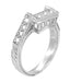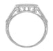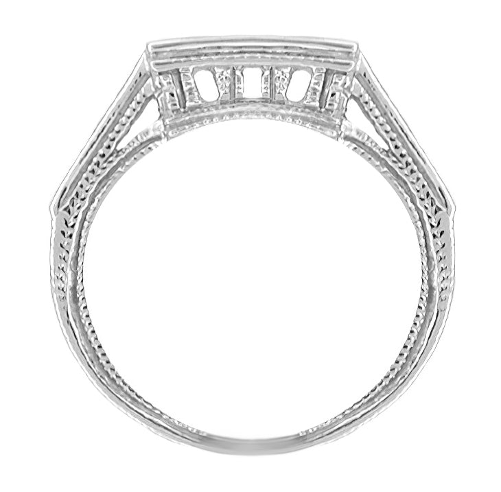 The ornate engraved square castle filigree bridge is designed to beautifully frame our Art Deco 3/4 Carat Princess Cut Diamond Engagement Ring Setting in Platinum, item # R660. The smooth and high polished square contoured inner side of this wedding ring is made to ensure that the rings fit smoothly and snugly together.