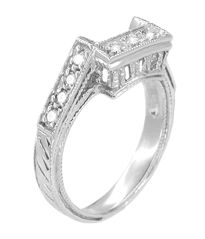 The ornate engraved castle filigree bridge is designed to perfectly complement our Art Deco 3/4 Carat Princess Cut Diamond Engagement Ring Mounting in 18 Karat White Gold, item # R662. The smooth and high polished square contoured inner side of this wedding ring is made to ensure that the rings fit smoothly and snugly together.