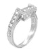 Meticulously crafted in 18K white gold, this beautiful Art Deco castle wedding ring is carved on the outside of the band with a wheat pattern and framed with double millgrain edging on the sides.