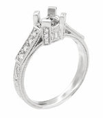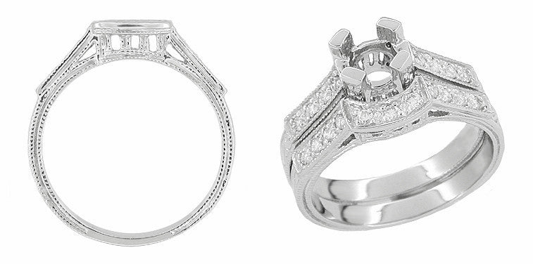 Artisan crafted in 18K white gold, this vintage design Art Deco engraved filigree curved wedding ring is carved on the outside of the band with a scroll pattern framed with double millgrain edging on the sides. The ornate engraved curved filigree bridge is designed to beautifully frame our item # R714. The smooth and high polished curved inner side of this wedding ring is made to ensure that the rings fit smoothly and snugly together.