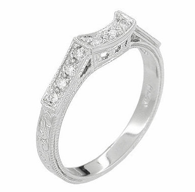 This beautiful 950 palladium Art Deco inspired wedding ring is hand engraved on the outside of the band with an elegant scroll pattern, and framed with double millgrain edging on the sides.